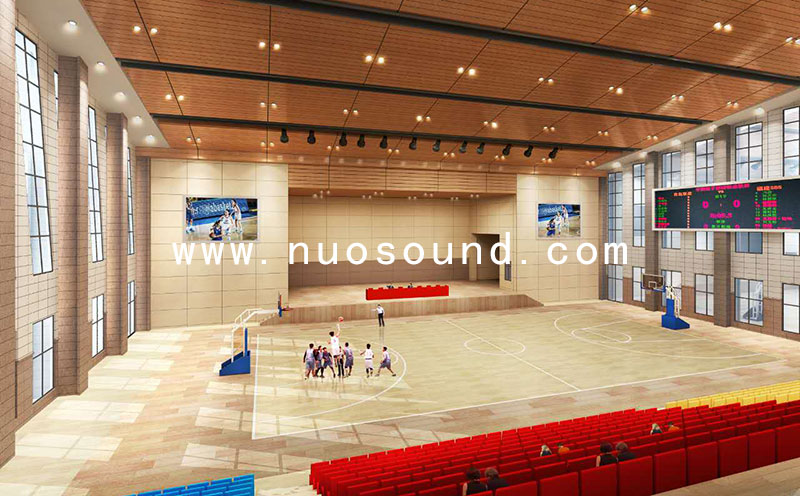 一般來說,多功能體育館建筑聲學(xué)設(shè)計的基本要求是要達(dá)到足夠的響度、滿意的清晰度、全場有比較均勻的效果以及無回聲干擾等物理缺陷,除了基本的設(shè)計之外,吸音材料的選擇也很重要。諾聲聲學(xué)向校方推薦的產(chǎn)品是諾聲體育館孔木吸音板。